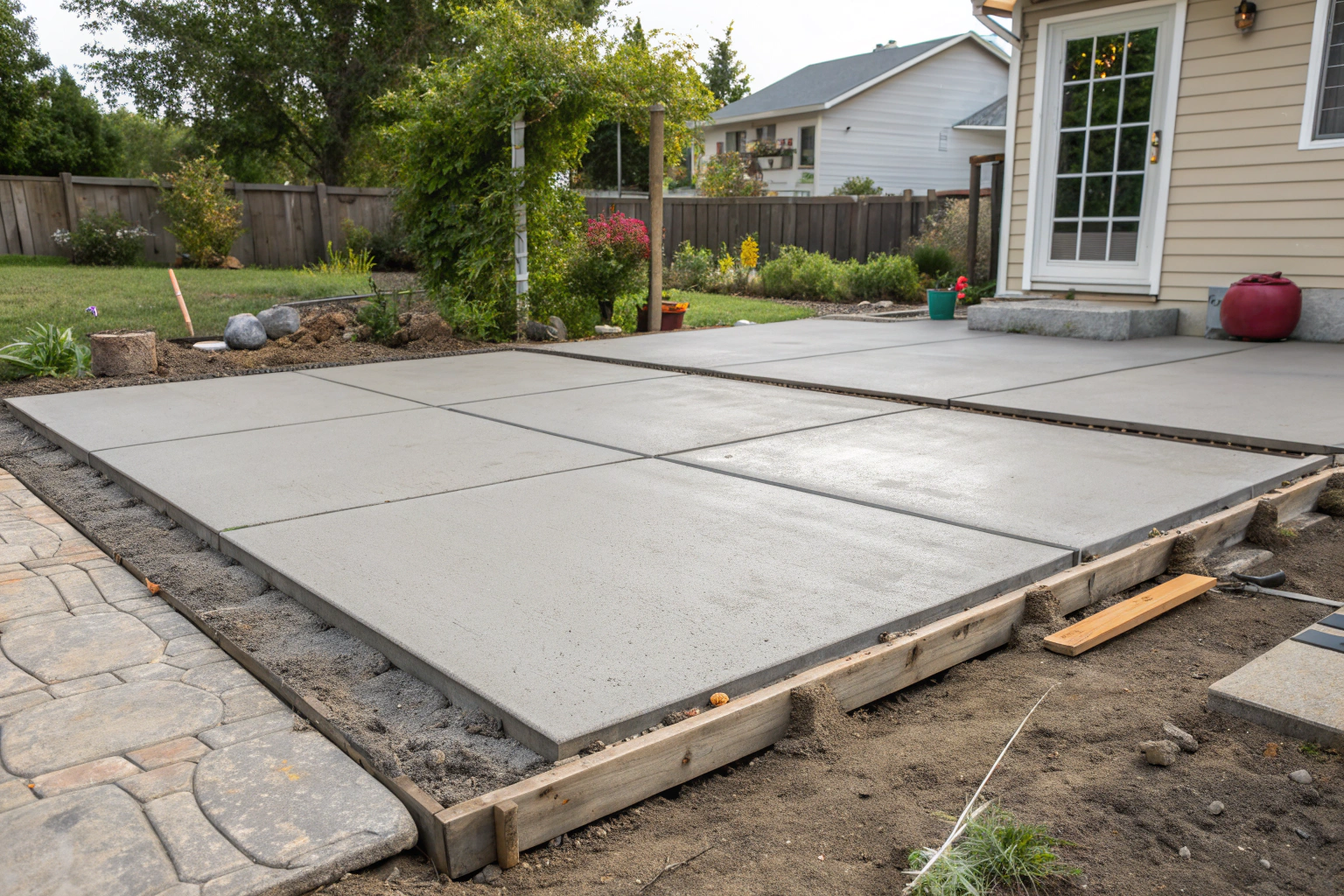 Concrete slabs form the most common patio base. We excavate, compact, and pour to create a stable surface that won’t shift. Finish options include: