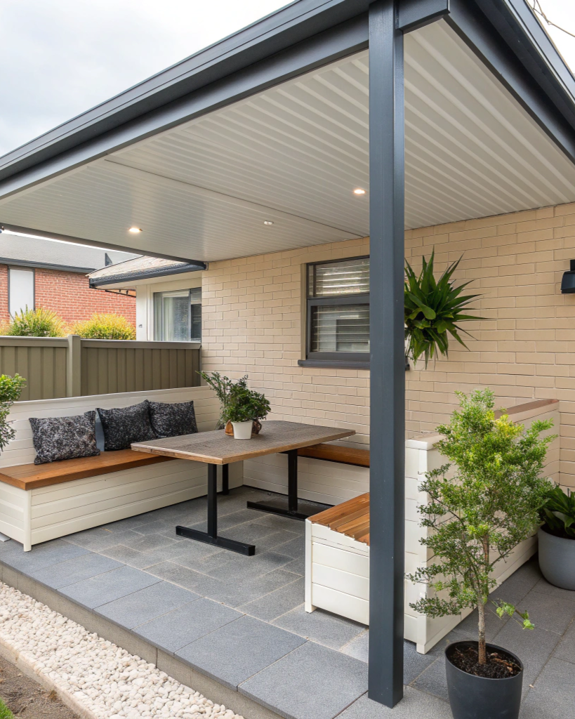 Modern designs feature clean lines, minimal posts, and integrated lighting. Steel frames with Colorbond roofing suit contemporary homes.